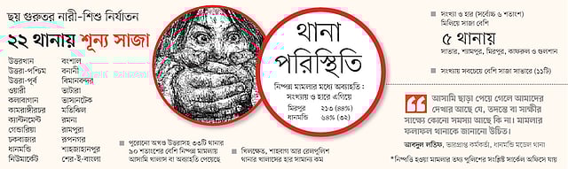 ধর্ষণ, গণধর্ষণ, ধর্ষণ করে হত্যা, যৌতুকের জন্য হত্যা, সম্ভ্রমহানি করে আত্মহত্যায় প্ররোচনা আর যৌন পীড়ন—এই অপরাধগুলোয় জেলার পাঁচ ট্রাইব্যুনালের তিনটিতেই প্রথম আলোর দেখা মামলাগুলোতে সাজার হার ছিল ১-২ শতাংশ। অন্যদিকে ১৫ বছরে ২২টি থানার তদন্ত করা একটি মামলাতেও কারও সাজা হয়নি।