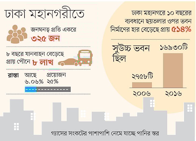 ঢাকা মহানগরে ১০ বছরের ব্যবধানে ছয়তলার ওপর ভবন নির্মাণের হার বেড়েছে প্রায় ৫১৪ শতাংশ। উঁচু ভবন তৈরির ক্ষেত্রে পর্যাপ্ত জায়গা ছাড়া হচ্ছে না। ফলে জনঘনত্বের পাশাপাশি বাড়ছে যানজট। পানি ও গ্যাসের মতো নাগরিক পরিষেবায় চাপ বাড়ছে।