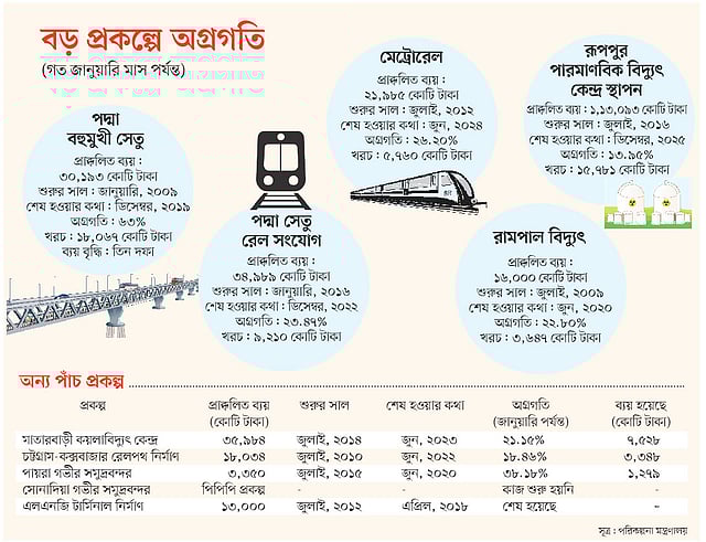 পদ্মা সেতুর কাজ এগিয়েছে সবচেয়ে বেশি। দৃশ্যমান ঢাকার মেট্রোরেল। মহেশখালীতে তৈরি হয়েছে এলএনজি টার্মিনাল। প্রায় ১০ বছরে সরকারের অগ্রাধিকার ১০ প্রকল্পের তিনটির চিত্র এ রকমই। অবশ্য এই তিন প্রকল্পের ব্যয় বেড়েছে অনেক বেশি, সময়ও লেগেছে বেশি। এতে এসব প্রকল্পের অর্থনৈতিক উপযোগিতাও কমছে। বাকি সাত প্রকল্পের কাজ তেমন আগায়নি।