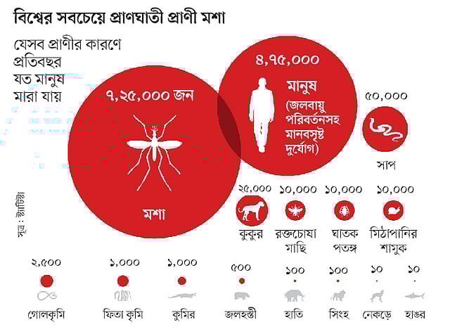 বিশ্ব স্বাস্থ্য সংস্থা (ডব্লিউএইচও) বলছে, মশা হলো বিশ্বের সবচেয়ে প্রাণঘাতী প্রাণী। জীবাণু বহন ও তা মানুষে ছড়িয়ে দেওয়ার সক্ষমতা থাকায় মশার কারণে বিশ্বজুড়ে প্রতিবছর লাখো মানুষের মৃত্যু হয়। ২০১৫ সালে শুধু ম্যালেরিয়ায় আক্রান্ত হয়ে প্রাণ গেছে প্রায় সাড়ে চার লাখ মানুষের। ডব্লিউএইচওর তথ্যমতে, বিশ্বের মোট জনসংখ্যার অর্ধেকের বেশি এমন সব এলাকায় বাস করে, যেখানে মশার উপস্থিতি রয়েছে। গত ৩০ বছরে বিশ্বজুড়ে ডেঙ্গুর প্রকোপ বেড়েছে ৩০ গুণ। এ ছাড়া জিকা, চিকুনগুনিয়া ও ইয়েলো ফিভারের মতো রোগের প্রাদুর্ভাবও ঘটছে এডিস মশার কারণে।