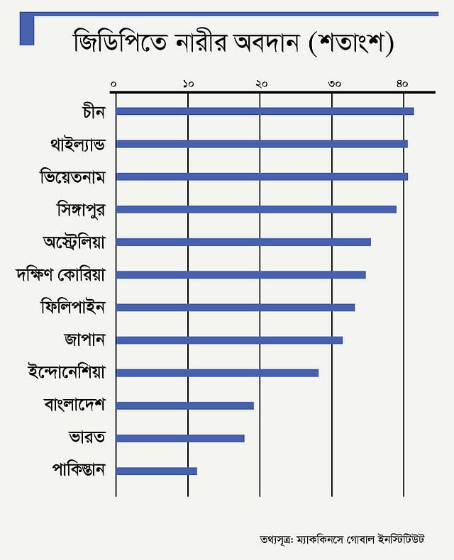 এ বিষয়ে ম্যাককিনসে একটি তালিকা প্রকাশ করেছে। তালিকায় দেখা যায়, জিডিপিতে নারীর অবদান থাইল্যান্ড, ভিয়েতনাম, সিঙ্গাপুর, অস্ট্রেলিয়ায় ৩৫ থেকে ৪০ শতাংশ। দক্ষিণ কোরিয়া, ফিলিপাইনস, জাপান, ইন্দোনেশিয়ায় এই হার ৩০ থেকে ৩৫ শতাংশ। তবে বাংলাদেশ, ভারত ও পাকিস্তানে এই হার বেশ কম। জিডিপিতে নারীর অবদান বাংলাদেশে ১৯ শতাংশ, ভারতে ১৮ শতাংশ ও পাকিস্তানে ১০ শতাংশ।