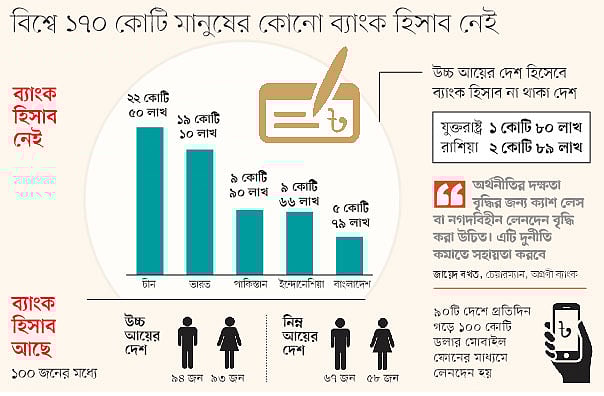 - বিশ্বব্যাংক বলছে, ৫ কোটি ৭৯ লাখ প্রাপ্তবয়স্ক নাগরিকের কোনো ব্যাংক হিসাব নেই