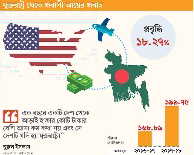 আমেরিকান চেম্বার অব কমার্স ইন বাংলাদেশের (অ্যামচেম) সভাপতি নুরুল ইসলাম বলেন, ‘যুক্তরাষ্ট্র থেকে প্রবাসী আয় বৃদ্ধির বিষয়টি ভালো খবর। এক বছরে একটি দেশ থেকে আড়াই হাজার কোটি টাকা বেশি আসা কম কথা নয় এবং সে দেশটি যদি হয় যুক্তরাষ্ট্র। আশা করছি, চলতি ২০১৮-১৯ অর্থবছর শেষে দেশটি থেকে আরও বেশি প্রবাসী আয় আসবে।’