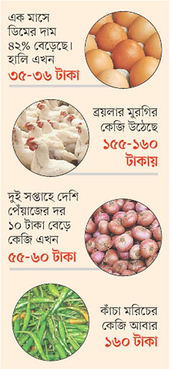 ব্যবসায়ীরা বলছেন, চারটি পণ্যের দামই বেড়েছে সরবরাহে টান পড়ার কারণে। টানা বৃষ্টি শেষ হলে দর কিছুটা কমতে পারে।