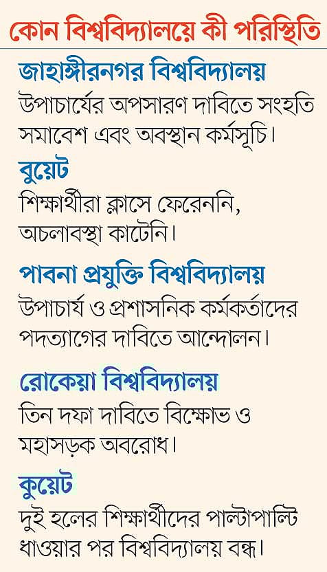 এ ছাড়া দেশের আরও চারটি বিশ্ববিদ্যালয়ে চলছে অস্থিরতা। এর মধ্যে বাংলাদেশ প্রকৌশল বিশ্ববিদ্যালয়ে (বুয়েট) এক মাস ধরে একাডেমিক কার্যক্রম বন্ধ রয়েছে। কবে নাগাদ শিক্ষার্থীরা শ্রেণিকক্ষে ফিরবেন, তাও অনিশ্চিত। পাবনা বিজ্ঞান ও প্রযুক্তি বিশ্ববিদ্যালয়ে (পাবিপ্রবি) শিক্ষার্থীরা ১০ দিন ধরে উপাচার্য ও প্রশাসনিক কর্মকর্তাদের পদত্যাগের দাবিতে আন্দোলন করছেন।