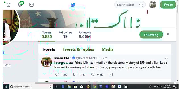 ভারতের লোকসভা নির্বাচনে ক্ষমতাসীন বিজেপি জোট নিশ্চিত জয়ের পথে থাকায় ভারতের প্রধানমন্ত্রী নরেন্দ্র মোদিকে অভিনন্দন জানিয়েছেন পাকিস্তানের প্রধানমন্ত্রী ইমরান খান। আজ বৃহস্পতিবার এক টুইট বার্তায় ইমরান খান এ অভিনন্দন জানান।