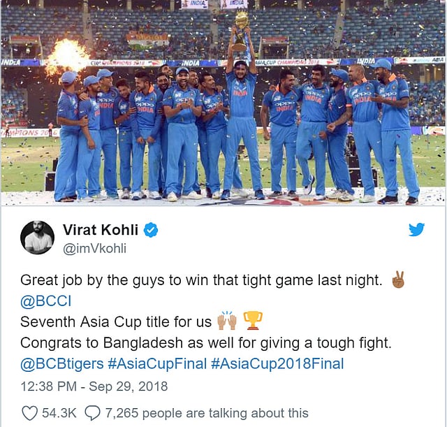 কাল এশিয়া কাপের ফাইনালে আগে ব্যাটিংয়ে নেমে ২২২ রান তুলেছিল বাংলাদেশ। তাড়া করতে নেমে হারতে হারতে জিতেছে রোহিত শর্মার দল। শেষ ওভারে দরকার ছিল ৬ রান। ম্যাচটা শেষ বল পর্যন্ত টেনে নিয়ে সহজ এ লক্ষ্যকেও কঠিন বানিয়ে ছেড়েছিলেন মাহমুদউল্লাহ। ভারত শেষ পর্যন্ত শিরোপা জিতলেও বাংলাদেশের পারফরম্যান্সের প্রশংসা করেছেন দেশটির সাবেক খেলোয়াড়েরাই। শেবাগ, লক্ষণ, কাইফরা ভূয়সী প্রশংসা করেছেন বাংলাদেশ দলের লড়াইয়ের। ভারতীয় দলের নিয়মিত অধিনায়কও হাঁটলেন একই পথে। সামাজিক যোগাযোগমাধ্যম টুইটারে কোহলির টুইট, ‘গত রাতে দারুণ খেলে কঠিন ম্যাচটা জিতেছে ছেলেরা। এশিয়া কাপে সপ্তম শিরোপা। হাড্ডাহাড্ডি লড়াইয়ের জন্য বাংলাদেশকেও অভিনন্দন।’