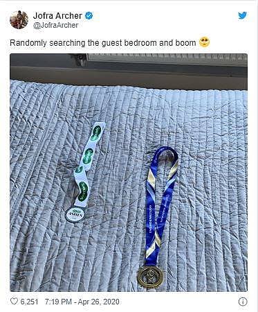 সেই বিশ্বকাপ জয়ের স্মারকটিই হারিয়ে ফেলেছিলেন আর্চার। করোনাভাইরাসের এই লকডাউনের সময়টা তাঁর কেটেছে সেই সাধের স্মারক পদক খুঁজেই। কোথাও পাচ্ছিলেন না সেটি তিনি। খুঁজতে খুঁজতে পাওয়ার আশাই যখন প্রায় ছেড়ে দিয়েছেন তখন সেই স্মারক–পদক তিনি খুঁজে পেয়েছেন বাড়ির গেস্ট রুমে। পদক খুঁজে পাওয়ার স্বস্তির সংবাদটা আর্চার নিজেই দিয়েছেন টুইটারে।