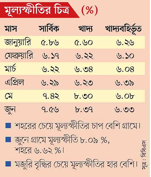 বিবিএসের তথ্য অনুযায়ী, জুন মাসে গ্রামাঞ্চলে খাদ্যের মূল্যস্ফীতি পৌঁছেছে ৮ দশমিক ৯৩ শতাংশে। শহরাঞ্চলে এই হার ৭ দশমিক ১১ শতাংশ।