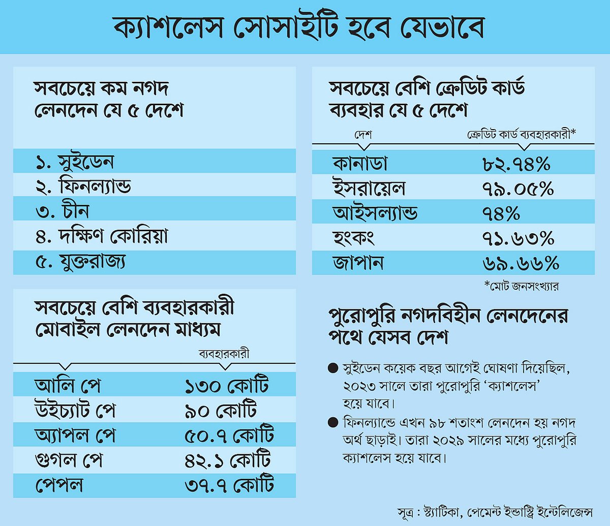 সেই ক্যাশলেস সোসাইটিই এখন বড় বাস্তবতা, যার অনেকটা নজির দেখা গেল দক্ষিণ কোরিয়ায়। যদিও ক্যাশলেস দেশের সবচেয়ে বড় উদাহরণ এখন সুইডেন। তারা বেশ কয়েক বছর আগেই ঘোষণা দিয়েছিল যে ২০২৩ সালের মার্চে তারা পুরোপুরি ‘ক্যাশলেস’ হয়ে যাবে। অর্থাৎ আর কোনো নগদ অর্থের লেনদেন নয়। এ জন্য অবশ্য দেশটি দীর্ঘ প্রস্তুতি নিয়েছে। নতুন আইনও করেছে। ফলে এখন ব্যক্তিগত সংগ্রহ বা জাদুঘর ছাড়া সুইডেনের মুদ্রা ক্রোনার আর দেখা যাবে না। মজার ব্যাপার হলো, ১৬৬১ সালে ইউরোপে সুইডেনই প্রথম দেশ, যারা ব্যাংক নোট চালু করেছিল। আর সেই সুইডেনই প্রথম ব্যাংক নোট লেনদেন বন্ধ করে দিল।