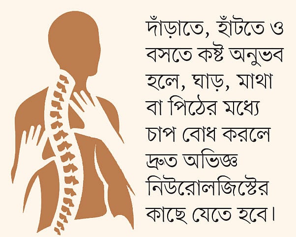 যদি দাঁড়াতে, হাঁটতে ও বসতে সব সময় কষ্ট অনুভব করে থাকেন; ঘাড়, মাথা বা পিঠের মধ্যে চাপ বোধ করেন; মলমূত্র নিয়ন্ত্রণে সমস্যা হয়; হাত বা পায়ের আঙুলে স্পর্শের অনুভূতি হারিয়ে ফেলেন তবে দ্রুত অভিজ্ঞ নিউরোলজিস্টের কাছে যেতে হবে। যত তাড়াতাড়ি সম্ভব চিকিৎসা শুরু করা দরকার। নিউরোলজিস্ট প্রদাহ কমাতে ও ব্যথা কমানোর ওষুধ দিতে পারেন। আঘাতের মাত্রা বেশি ও অস্ত্রোপচারের প্রয়োজন হলে দ্রুতই তা করতে হবে। ফিজিওথেরাপিরও প্রয়োজন হতে পারে। এটি শরীরের আঘাত পাওয়া অংশে গতিশীলতা, শক্তি ও সংবেদন ফিরে পেতে সহায়তা করবে। মনে রাখবেন, মেরুদণ্ডের ক্ষতি বেশির ভাগ ক্ষেত্রে পুরোপুরি নিরাময় হয় না।