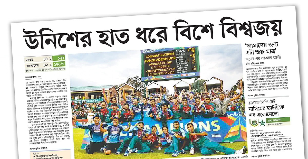 প্রথম আলোর পাতায় সেটির কমতি ছিলও না সেদিন। প্রথম পাতায় ট্রফি নিয়ে বিশ্বজয়ী যুবাদের উল্লাসের চার কলাম ছবি। ওপরে কাগজের এ মাথা থেকে ও মাথা ব্যানার শিরোনাম ‘উনিশের হাত ধরে বিশে বিশ্বজয়’। সাংবাদিকতার মৌলিক ব্যাকরণ প্রতিবেদনের শুরুতে ‘ফাইভ ডব্লিউ, ওয়ান এইচ’–এর কথা বলে। অনলাইন সাংবাদিকতার যুগে ছাপা সংস্করণে সেই শর্ত সব সময় মানা না গেলেও সেদিনের ওই এক শিরোনামেই যেন লিখে দেওয়া হলো সব প্রশ্নের উত্তর। বাংলাদেশের অনূর্ধ্ব-১৯ যুবাদের ২০২০ সালে বিশ্বজয়ের পুরো গল্পই জায়গা হয়ে গেল পাঁচ শব্দের শিরোনামে।