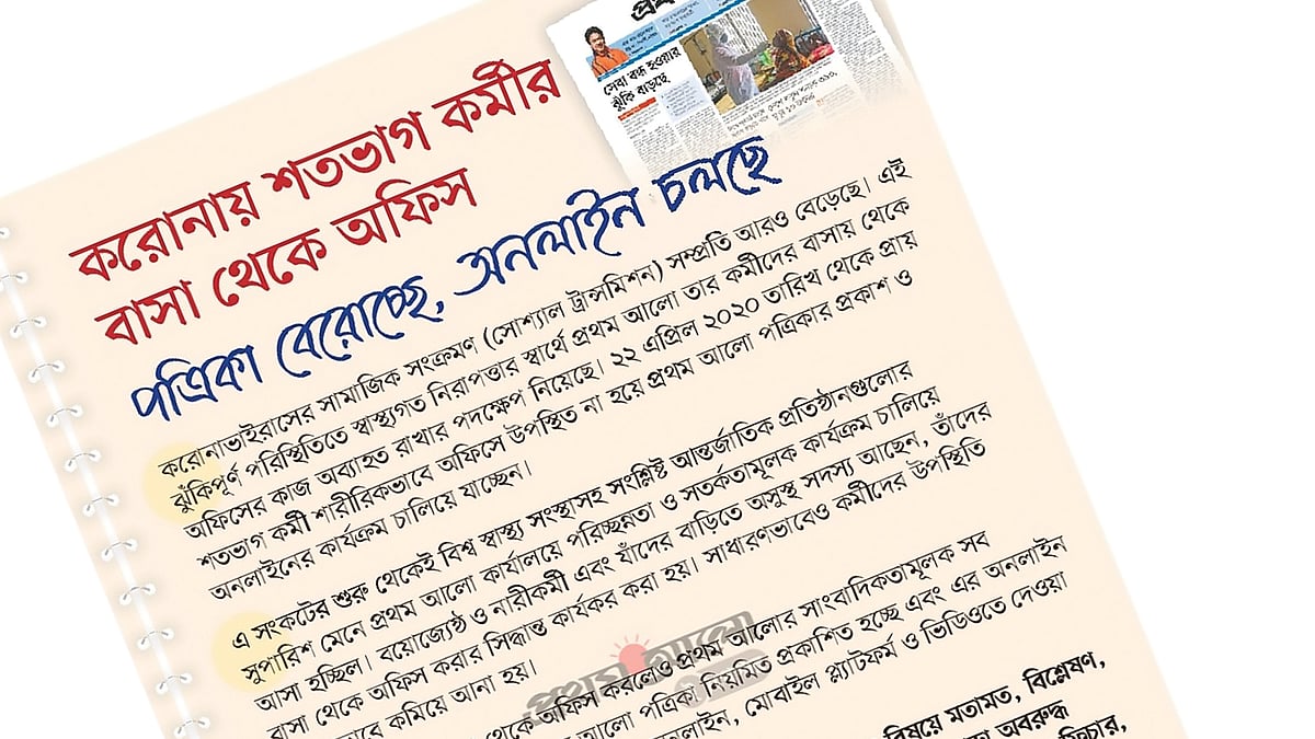 আবেদন না করেই ছুটি পেয়ে গেলেন কিছু কর্মী। একটি অংশকে পাঠানো হলো ‘হোম অফিসে’। কিন্তু বাসায় থেকে কীভাবে অফিস করবেন, বিষয়টি তখনো অনেকের কাছে স্পষ্ট ছিল না। এর সবই করা হলো সতর্কতার অংশ হিসেবে, যাতে সবাইকে সুরক্ষিত রাখা যায়। তবে নানামুখী উদ্যোগ নেওয়ার পরও করোনাকে ফাঁকি দেওয়া যায়নি। কয়েক দিনের মধ্যেই আমাদের একজন জ্যেষ্ঠ সহকর্মী আক্রান্ত হলেন। এর এক দিনের মাথায় মাত্র কয়েক ঘণ্টার নোটিশে ২১ এপ্রিল থেকে শুরু হলো শতভাগ হোম অফিস।