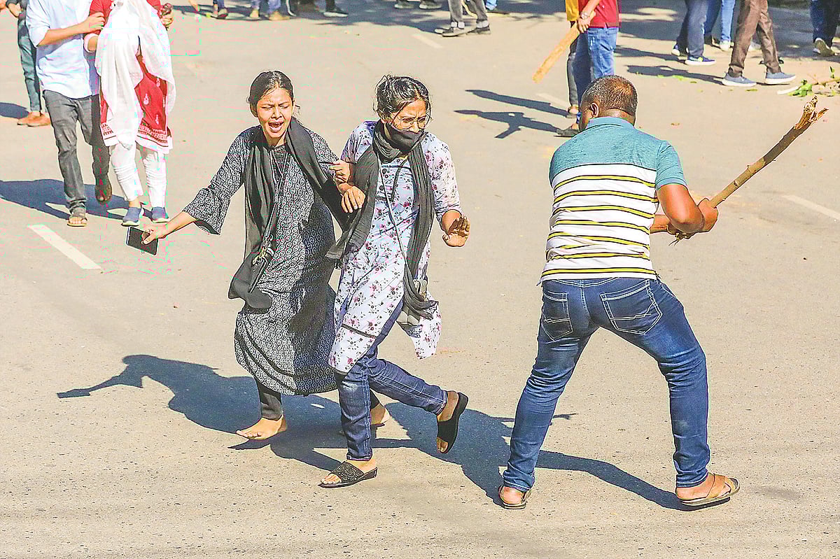 তখনো চলছে ছাত্রলীগের তাণ্ডব। হকিস্টিক, রামদা দিয়ে চড়াও হয়েছেন আন্দোলনকারীদের ওপর। ব্যথা ভুলে আবারও শুরু করলাম ছবি তোলা। একপর্যায়ে বিকেল পৌনে চারটার দিকে আন্দোলনকারীরা পিছু হটে ফুলার রোড ও নীলক্ষেত মোড়ের দিকে ছুটতে থাকেন। তখন সামনে যাঁকে পান, তাঁকেই মারধর করেন ছাত্রলীগের নেতা-কর্মীরা। এ সময় মল চত্বরে আন্দোলনে যুক্ত অনেক ছাত্রীও ছাত্রলীগের নেতা-কর্মীদের মারধরের শিকার হন। আমার হাতের ব্যথাও তীব্র হচ্ছিল। মল চত্বরের সড়ক বিভাজকে দাঁড়িয়ে এক হাতেই ছবি তুলছিলাম। তখন পালিয়ে যাওয়ার সময় দুজন ছাত্রীকে মারতে উদ্যত হচ্ছিলেন এক ছাত্রলীগ কর্মী। ছাত্রী দুজনের চোখেমুখে ছিল আতঙ্ক। এক হাতেই তুলে ফেলি ছবিটা।