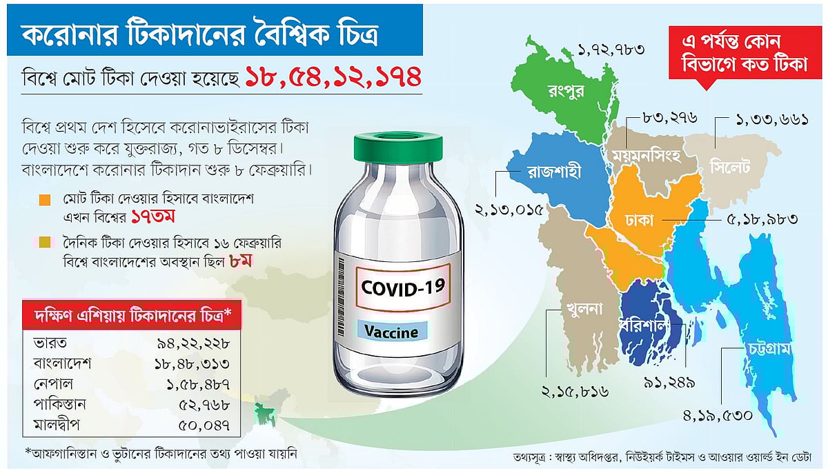 এই তথ্য বিবেচনায় নিলে বাংলাদেশ টিকা শুধু সংগ্রহই করেনি, প্রতিদিন বিপুলসংখ্যক মানুষকে টিকা দিয়ে চলেছে। গতকাল বৃহস্পতিবার ২ লাখ ৬১ হাজার ৯৪৫ জন মানুষকে টিকা দেওয়া হয়েছে। পরপর চার দিন গড়ে ২ লাখ ২৬ হাজারের বেশি মানুষকে টিকা দিতে পেরেছেন স্বাস্থ্যকর্মীরা। এ পর্যন্ত দেশে ১৮ লাখ ৪৮ হাজার ৩১৩ জন করোনার টিকা নিয়েছেন।