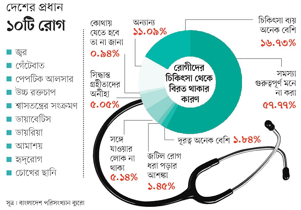 বিবিএসের রোগগ্রস্তবিষয়ক জরিপ (২০১৪) বলছে, প্রতি এক হাজার মানুষের মধ্যে ১৭০ জন কোনো না কোনো রোগে আক্রান্ত থাকে। সবচেয়ে বেশি আক্রান্ত হয় জ্বরে। অন্যদিকে গেঁটেবাত, ডায়াবেটিস, হৃদ্রোগ, ক্যানসার—এসব অসংক্রামক রোগ আগের চেয়ে বাড়ছে।