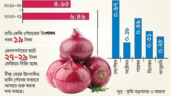 এদিকে কৃষকেরা উৎপাদন বাড়ানোয় আমদানি কমছে। কৃষি বিপণন অধিদপ্তর থেকে চলতি সপ্তাহে প্রধানমন্ত্রীর কার্যালয়ে পেঁয়াজের দাম বেড়ে যাওয়া নিয়ে একটি প্রতিবেদন দেওয়া হয়। এতে দেখা যায়, নভেম্বরে ৪৬ হাজার টন পেঁয়াজ এসেছিল। জানুয়ারিতে তা ২৫ হাজার টনে নেমে আসে। নভেম্বরে যে পেঁয়াজ গড়ে প্রতি কেজি ৭২ টাকা ছিল, তা জানুয়ারিতে কমে ৩৭ টাকায় নামে।