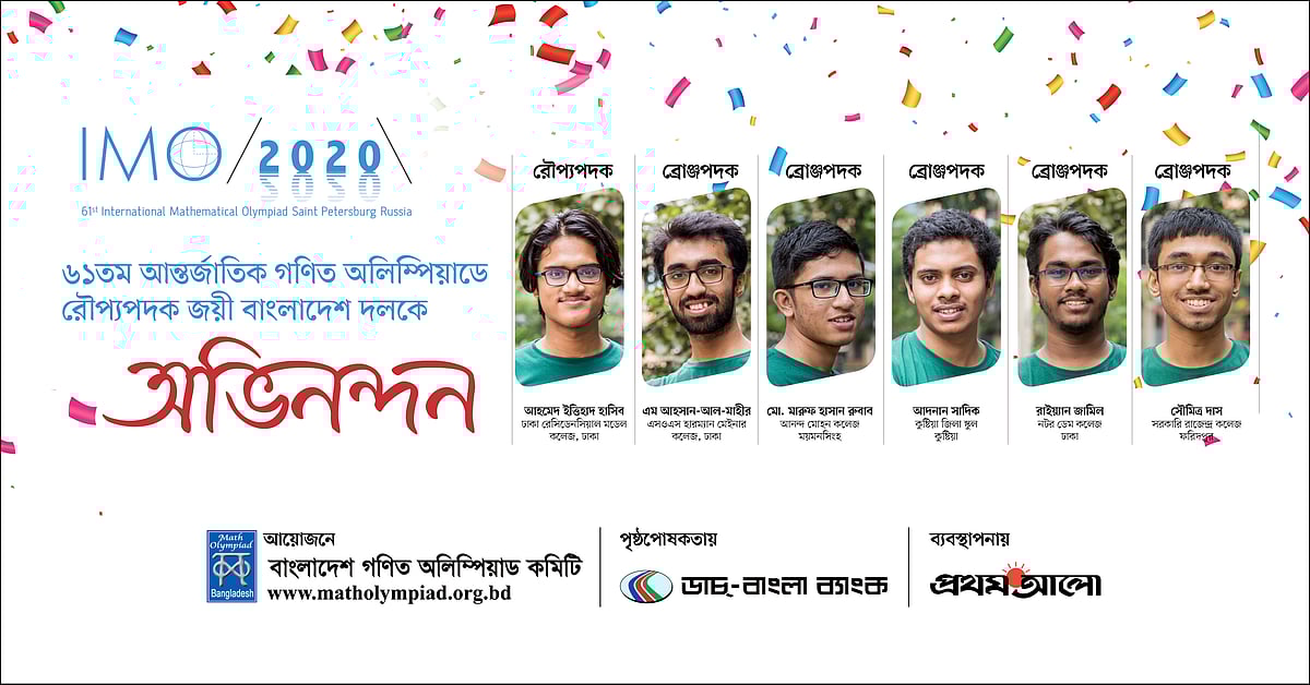 আন্তর্জাতিক গণিত অলিম্পিয়াডে (আইএমও) দলীয় সর্বোচ্চ নম্বর ও সব সদস্যের পদকপ্রাপ্তির মাধ্যমে শেষ হলো ৬১তম আন্তর্জাতিক গণিত অলিম্পিয়াডে (আইএমও) বাংলাদেশের যাত্রা। রাশিয়ার সেন্ট পিটার্সবার্গ থেকে ভার্চ্যুয়ালি অনুষ্ঠিত ৬১তম আইএমওতে বাংলাদেশ ১টি রুপার পদক ও ৫টি ব্রোঞ্জপদক পেয়েছে। মোট ১১৮ নম্বর পেয়ে ১০৭টি দেশের মধ্যে ৩৮তম স্থান অধিকার করেছে বাংলাদেশ। আজ রোববার আন্তর্জাতিক গণিত অলিম্পিয়াডের ওয়েবসাইটে পুরস্কার বিজয়ীদের নামের তালিকা প্রকাশ করা হয়েছে।