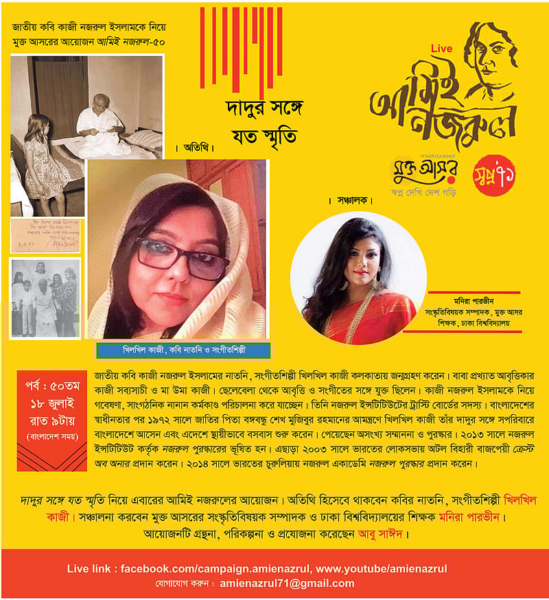 জাতীয় কবি কাজী নজরুল ইসলামকে নিয়ে অনলাইনে মুক্ত আসরের নিয়মিত আয়োজন ‘আমিই নজরুল’। আজ শনিবার (১৮ জুলাই) ৫০তম পর্ব। এবারের বিষয় দাদুর সঙ্গে যত স্মৃতি। এই বিষয়ে কথা বলবেন কবির নাতনি ও সংগীতশিল্পী খিলখিল কাজী।