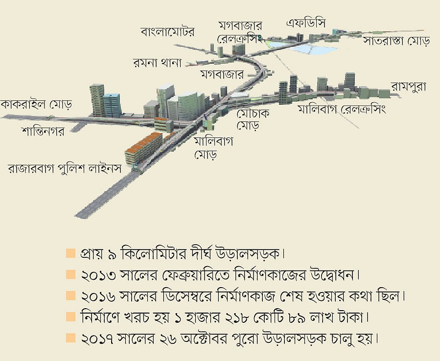 প্রায় নয় কিলোমিটার দীর্ঘ উড়ালসড়কটির বেশির ভাগ অংশই ডিএসসিসিতে পড়েছে। কেবল মালিবাগ থেকে চৌধুরীপাড়ার আবুল হোটেল পর্যন্ত অংশ, মগবাজার মোড় থেকে সাতরাস্তা, এফডিসি থেকে সোনারগাঁও হোটেল মোড় পর্যন্ত অংশ ডিএনসিসিতে পড়েছে।