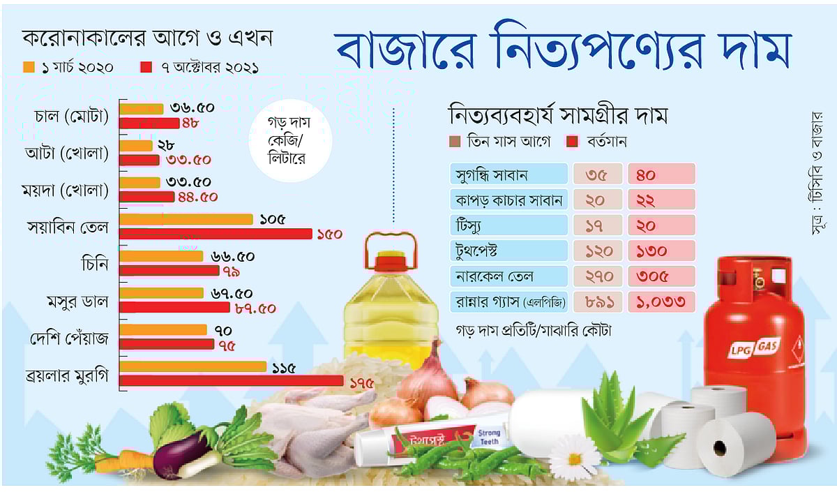 টিসিবির ২০২০ সালের ১ মার্চ ও গত বৃহস্পতিবারের বাজারদরের তালিকা পর্যালোচনা করে দেখা যায়, সে সময়ের তুলনায় এখন মোটা চালের গড় দাম সাড়ে ৩১ শতাংশ, খোলা আটার ২০, খোলা ময়দার ৩৩, এক লিটারের সয়াবিন তেলের বোতল ৪৩, চিনির ১৯, মোটা দানার মসুর ডাল ৩০ ও গুঁড়া দুধের ১৩ শতাংশ বেশি।