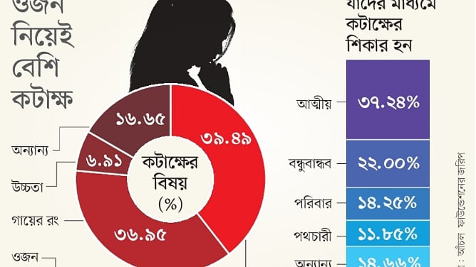 জরিপে অংশ নেওয়া ৩৭ শতাংশের বেশি তরুণী জানিয়েছেন, শরীরের আকৃতি, গঠন ও কাঠামো নিয়ে আত্মীয়রা কথা ও ইঙ্গিতে তাঁদের হেয় করেছেন। বন্ধুবান্ধবের কাছে কটাক্ষের শিকার হয়েছেন ২২ শতাংশ। পরিবারের সদস্যদের মুখে কটু মন্তব্য শুনেছেন বলে জানিয়েছেন ১৪ দশমিক ২৫ শতাংশ তরুণী। পথচারীদের কটাক্ষ শুনতে হয়েছে প্রায় ১২ শতাংশ তরুণীকে।