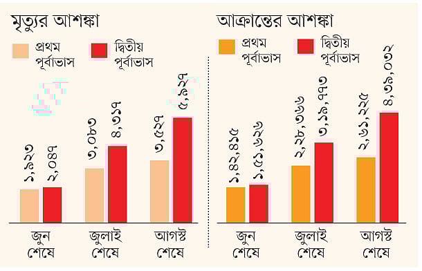 দুটি পৃথক পদ্ধতির ওপর ভিত্তি করে তৈরি দুই পূর্বাভাসে রোগী ও মৃত্যুর সংখ্যায় তফাত রয়েছে। প্রথম পূর্বাভাসে বলা হচ্ছে, এখন সংক্রমণ পরিস্থিতি চূড়ান্ত পর্যায়ের কাছাকাছি। জুলাইয়ের শেষ পর্যন্ত সংক্রমণ পরিস্থিতি চূড়ান্ত পর্যায়ে থাকার আশঙ্কা আছে। আগস্টের শেষের দিকে শনাক্ত রোগীর সংখ্যা ২ লাখ ৬০ হাজার ছাড়াতে পারে। মৃত্যু হতে পারে সাড়ে তিন হাজারের বেশি মানুষের।