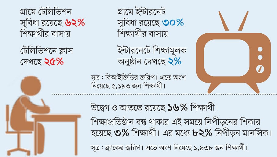 এ বিষয়ে বিআইজিডির ‘বাংলাদেশ: ফ্রম লার্নিং ক্রাইসিস টু আ পেনডেমিক’ শীর্ষক জরিপে বলা হয়েছে, সরকার টেলিভিশনের মাধ্যমে ‘ঘরে বসে শিখি’ ও ‘আমার ঘরে আমার স্কুল’ নামে প্রাথমিক ও মাধ্যমিকের পাঠ কার্যক্রম চালু করলেও তা দেখছে কমসংখ্যক। জরিপে অংশগ্রহণকারী ৫ হাজার ১৯৩ জন শিক্ষার্থীর মধ্যে গ্রামের শিক্ষার্থীদের ৬২ শতাংশের বাসায় টেলিভিশন সুবিধা রয়েছে। তবে টেলিভিশনে ক্লাস দেখছে মাত্র ২৫ শতাংশ। ৩০ শতাংশের বাসায় ইন্টারনেটের সুবিধা আছে। তবে ইন্টারনেটে ক্লাস করছে মাত্র ২ শতাংশ।