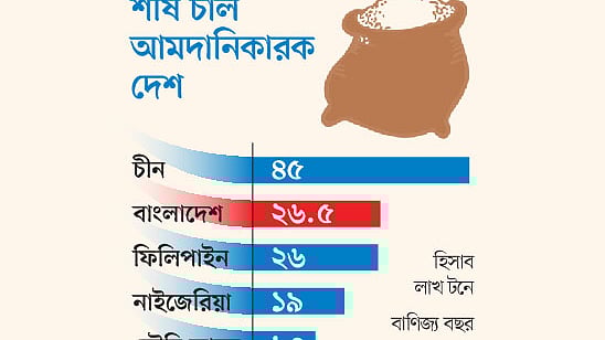 চালের বাজারে বড় আমদানিকারক চীন। নভেম্বর পর্যন্ত ১২ মাসে দেশটি ৪৫ লাখ টন চাল আমদানি করেছে। ফিলিপাইন করেছে বাংলাদেশের চেয়ে ৫০ হাজার টন কম, ২৬ লাখ টন। এ ছাড়া নাইজেরিয়া ১৯ লাখ টন ও সৌদি আরব ১৩ লাখ টন চাল আমদানি করেছে।