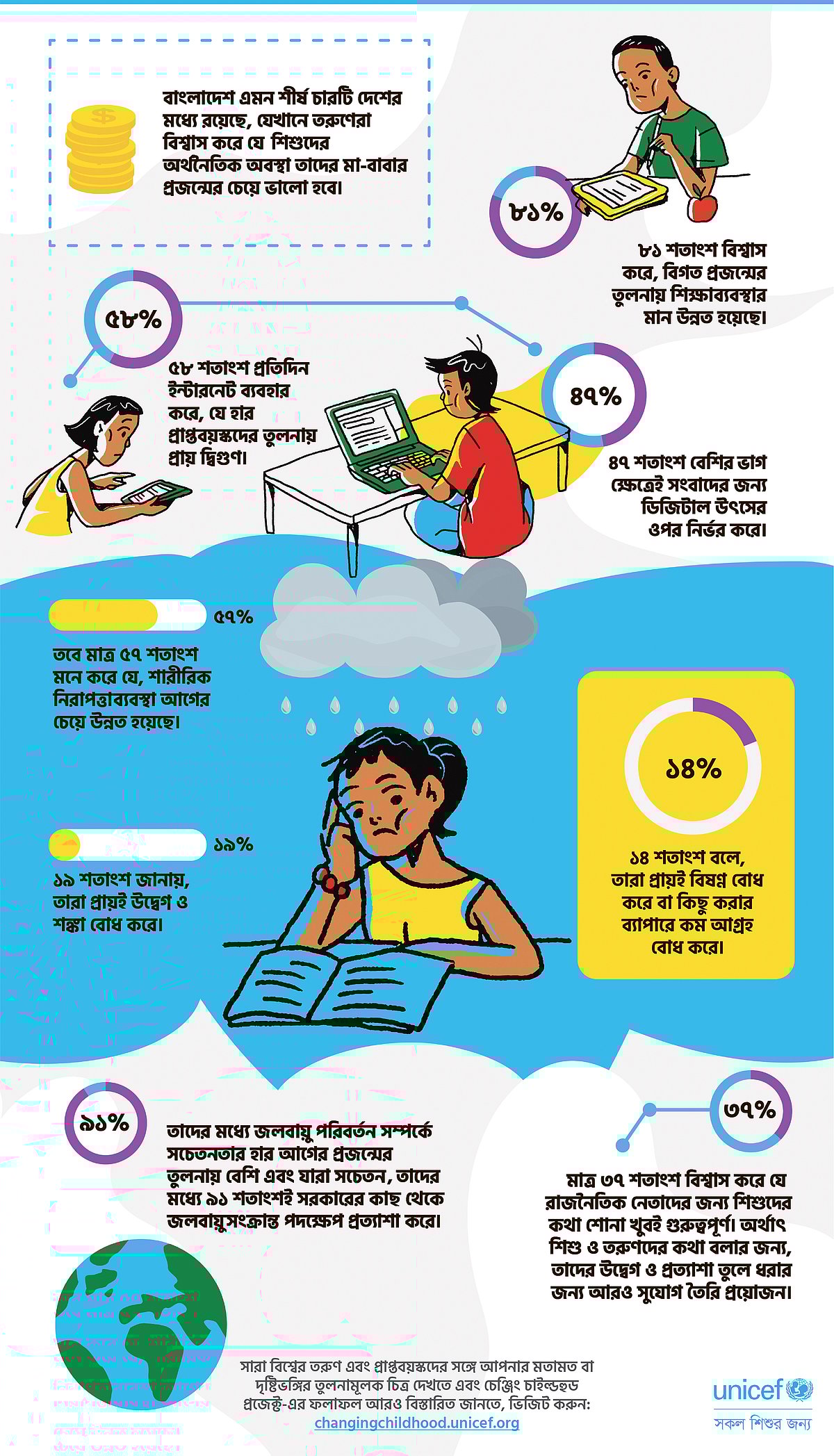 <p>ইউনিসেফ ও গ্যালাপ ২১টি দেশের তরুণ–তরুণীর কাছে জানতে চেয়েছিল: আজকের বিশ্বে বেড়ে ওঠার অভিজ্ঞতা কেমন?</p>