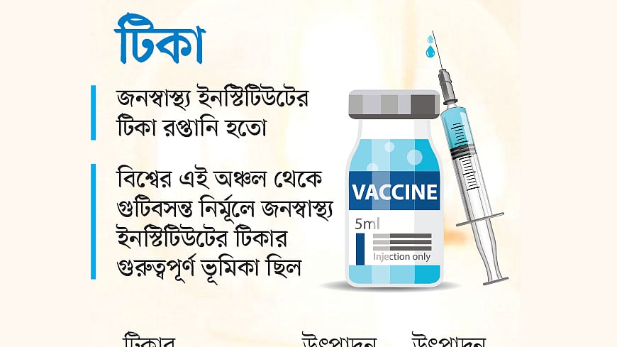 স্বাস্থ্য মন্ত্রণালয়ের জনস্বাস্থ্য ইনস্টিটিউট ছয় ধরনের টিকা উৎপাদন করত। বিশ্বের এই অঞ্চল থেকে গুটিবসন্ত নির্মূলে রাজধানীর মহাখালীর এই প্রতিষ্ঠানের উৎপাদিত টিকার বিশেষ ভূমিকা ছিল। ১০ বছর আগে মহাখালীর এই প্রতিষ্ঠানটি সর্বশেষ জলাতঙ্ক রোগের টিকা উৎপাদন করেছিল। তারপর টিকা উৎপাদন করার কার্যকর কোনো উদ্যোগ নেয়নি কর্তৃপক্ষ। এখন বিদেশ থেকে টিকা এনে সম্প্রসারিত টিকাদান কর্মসূচিতে (ইপিআই) ব্যবহার করা হয়।