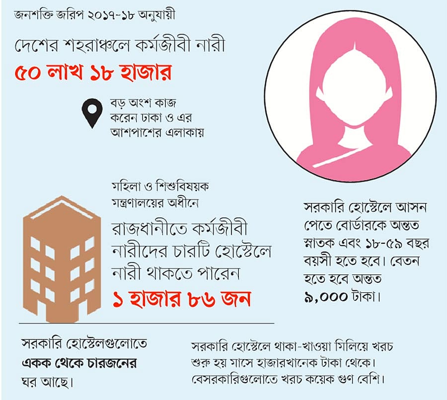 রাজধানীতে সরকারের চারটি কর্মজীবী মহিলা হোস্টেলে এক হাজারের কিছু বেশি আসন আছে। হোস্টেলমালিকদের একটি সমিতির একজন কর্মকর্তার ধারণা, ঢাকায় সাত শ থেকে আট শ বেসরকারি হোস্টেল আছে। সিংহভাগই নারীদের জন্য। সরকারি হোস্টেলে থাকা-খাওয়া মিলিয়ে খরচ শুরু হয় মাসে হাজারখানেক টাকা থেকে। বেসরকারিগুলোতে খরচ কয়েক গুণ বেশি। কোনো হোস্টেলেই সন্তানসহ থাকা যায় না।