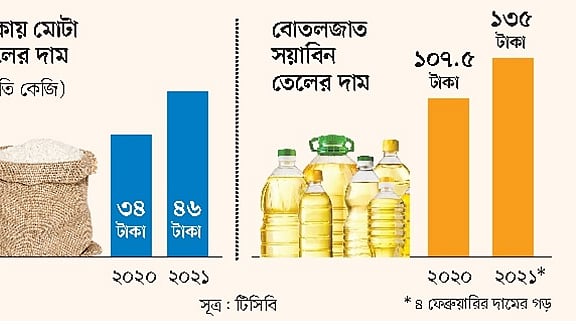 শুধু বোতলজাত সয়াবিন তেল নয়, খোলা সয়াবিন ও পাম তেলের দামও ব্যাপক চড়া। চারজনের একটি পরিবারে মাসে পাঁচ লিটারের মতো তেল লাগে। ফলে একটি পরিবারে ছয় মাস আগের তুলনায় এখন মাসে তেলবাবদ খরচ ১৬০ থেকে ১৭০ টাকা বেশি। বাজারে এখন চালের দাম চড়া। গত সপ্তাহে পেঁয়াজ, আটা, ময়দা, মসুর ডাল ও অ্যাংকর ডালের দাম কিছুটা বেড়েছে। সব মিলিয়ে বিপাকে সাধারণ মানুষ।
