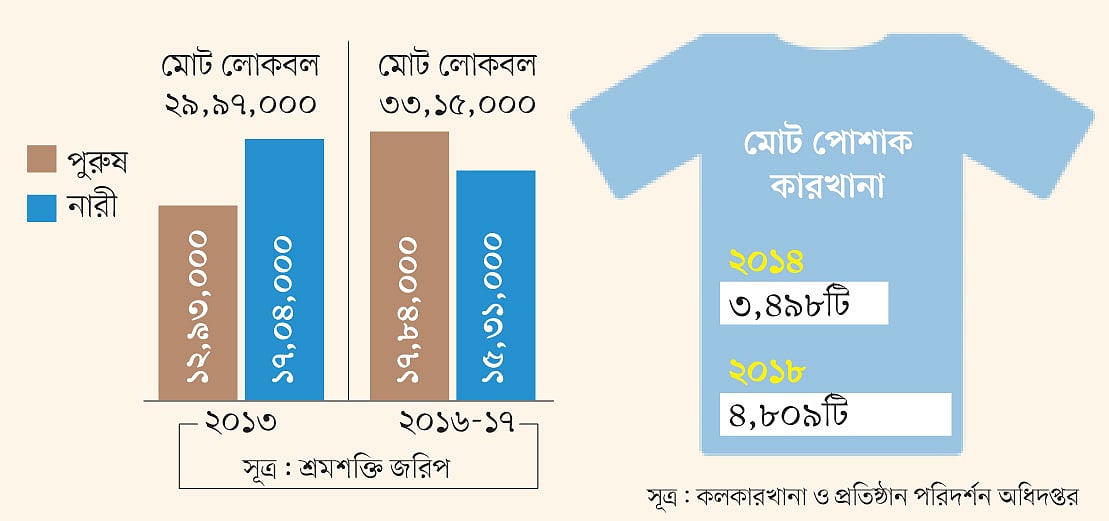 নারী শ্রমিকদের ওপর ভিত্তি করে গড়ে ওঠা তৈরি পোশাক খাতে নারীরাই পিছিয়ে পড়ছেন। এই খাতে নারী শ্রমিক কমে যাচ্ছে। নারীর তুলনায় পুরুষের সংখ্যা এখন বেশি। অথচ দেশে তৈরি পোশাক কারখানা ও শ্রমিকের সংখ্যা দুই-ই বেড়েছে। বিবিএসের সর্বশেষ শ্রমশক্তি জরিপ বলছে, পোশাকশিল্প খাতে পুরুষ এখন ৫৩ দশমিক ৮২ শতাংশ; বিপরীতে নারী আছেন ৪৬ দশমিক ১৮ শতাংশ।