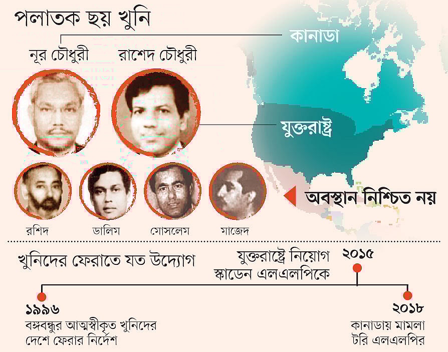 বঙ্গবন্ধু শেখ মুজিবুর রহমান হত্যা মামলার রায় কার্যকরের আট বছর পরও মৃত্যুদণ্ডপ্রাপ্ত ছয় খুনির চারজনের অবস্থান সম্পর্কে সরকার নিশ্চিত হতে পারেনি। অন্য দুজনকে ফেরাতে সরকারের কূটনৈতিক ও আইনি প্রক্রিয়া অব্যাহত রয়েছে।