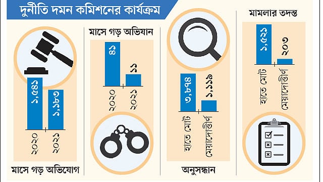 সূত্র জানায়, চলতি বছরের জানুয়ারি থেকে ৩১ অক্টোবর পর্যন্ত ১০ মাসে দুদকে মোট ১১ হাজার ৮২৮টি অভিযোগ জমা পড়ে; অর্থাৎ মাসে জমা পড়েছে গড়ে ১ হাজার ১৮৩টি অভিযোগ। ২০২০ সালে মাসে গড়ে ১ হাজার ৫৪১টি অভিযোগ জমা পড়েছিল। ওই বছর মোট জমা হওয়া অভিযোগের সংখ্যা ছিল ১৮ হাজার ৪৮৯।