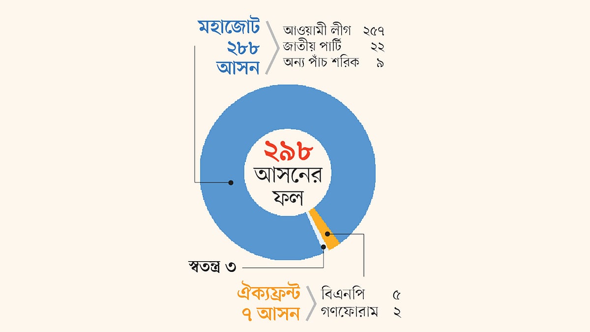 গত ৩০ ডিসেম্বর একাদশ জাতীয় সংসদ নির্বাচন অনুষ্ঠিত হয়। নির্বাচনে আওয়ামী লীগের নেতৃত্বাধীন মহাজোট ২৮৮টি আসনে জয়লাভ করে। আওয়ামী লীগ একাই জিতেছে ২৫৭টি আসনে। একক সংখ্যাগরিষ্ঠতা পাওয়ায় দলটি টানা তৃতীয়বারের মতো সরকার গঠন করতে যাচ্ছে। এই নির্বাচনে বিএনপির নেতৃত্বাধীন জোট পেয়েছে ৭টি আসন। বিএনপি এককভাবে পেয়েছে ৫টি। নির্বাচনে এককভাবে ২২টি আসন পেয়ে দ্বিতীয় বৃহত্তম দল হয়েছে জাতীয় পার্টি। একাদশ সংসদে তারাই বিরোধী দল হতে যাচ্ছে।