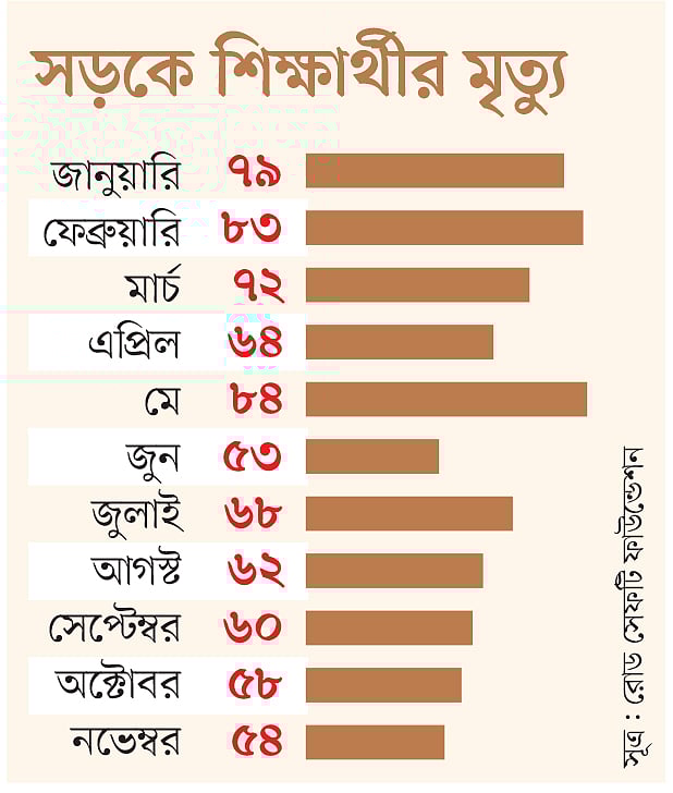 নিরাপদ সড়কের দাবিতে শিক্ষার্থীদের আন্দোলনের মধ্যেও সড়ক দুর্ঘটনায় মৃত্যু থেমে নেই। চলতি বছরের প্রথম ১১ মাসে সারা দেশে সড়ক দুর্ঘটনায় ৭৩৭ জন শিক্ষার্থী নিহত হয়েছেন। এর মধ্যে নভেম্বর মাসে মারা গেছেন ৫৪ জন শিক্ষার্থী। সড়কে মৃত্যুর এই তথ্য রোড সেফটি ফাউন্ডেশনের।