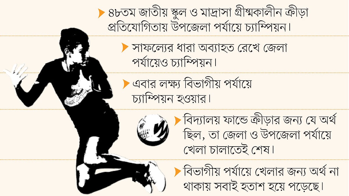 বিদ্যালয়ের প্রধান শিক্ষক মো. নজরুল ইসলাম জানান, উপজেলা ও জেলা পর্যায়ের খেলার খরচ বিদ্যালয়ের তহবিল থেকে চালানো হয়েছে। রোববার জেলা পর্যায়ের ফাইনালেও ১২ হাজার টাকা খরচ হয়েছে। এর মধ্যে ৭ হাজার টাকা উপজেলা ক্রীড়া সংস্থা থেকে দেওয়া হয়েছে। বাকি টাকা দেওয়া হয়েছে বিদ্যালয়ের তহবিল থেকে। বিভাগীয় পর্যায়ে খেলতে খরচ হবে ১৫-২০ হাজার টাকা। বর্তমানে তাঁদের হাতে কোনো টাকা নেই। ফলে আজ (সোমবার) প্রশিক্ষণ পর্যন্ত করতে পারেনি মেয়েরা।