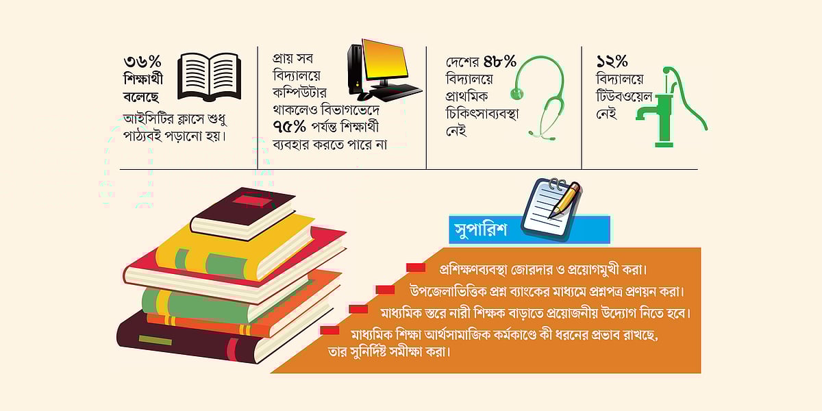 শুধু এই দুটি বিদ্যালয়েই নয়, সরকারের একটি প্রতিবেদন বলছে, শ্রেণিকক্ষ, বিজ্ঞানাগার, প্রাথমিক চিকিৎসা, স্যানিটেশন ব্যবস্থাসহ নানা ক্ষেত্রে ঘাটতি রয়েছে দেশের মাধ্যমিক স্তরের (সরকারি-বেসরকারি) শিক্ষাপ্রতিষ্ঠানে। শিক্ষার মান উন্নয়নের নানা দিকেও ঘাটতি রয়েছে। শিক্ষার্থীদের তুলনায় পর্যাপ্ত শিক্ষক নেই। সৃজনশীল পদ্ধতিতে শিক্ষার্থীদের মুখস্থ করার পরিবর্তে আত্মস্থ করার প্রবণতা বাড়লেও এ বিষয়ে শিক্ষকদের প্রশিক্ষণ খুব একটা কাজে আসছে না।