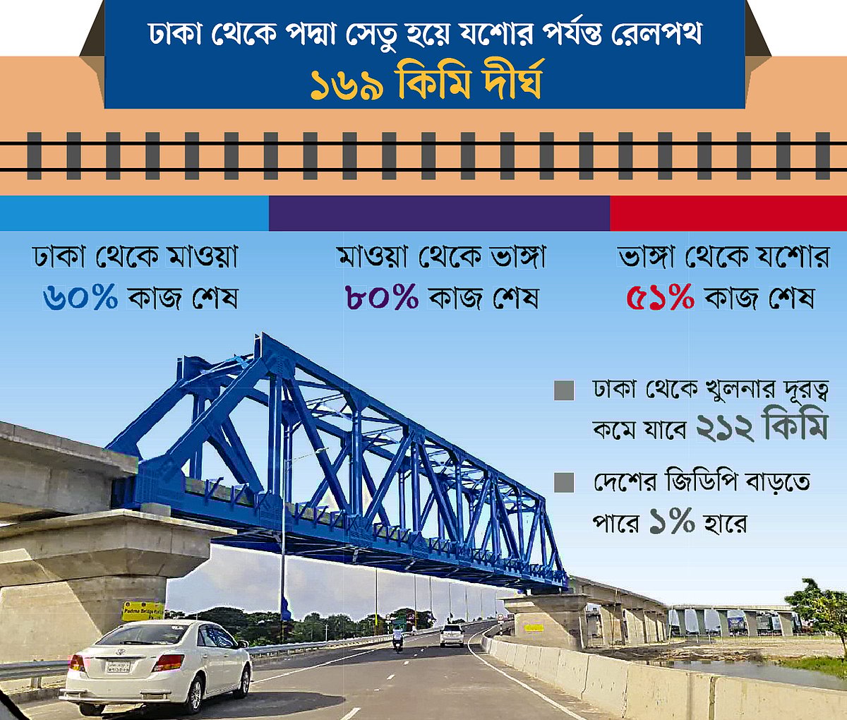 প্রকল্পের অগ্রগতি প্রতিবেদন অনুসারে, ঢাকা থেকে মাওয়া অংশের কাজ ৬০ শতাংশ শেষ হয়েছে। মাওয়া থেকে ভাঙ্গার কাজ শেষ হয়েছে ৮০ শতাংশ। ৫১ শতাংশ কাজ শেষ হয়েছে ভাঙা থেকে যশোর পর্যন্ত। এর মধ্যে পদ্মা সেতুর দুই প্রান্তে ১১ কিলোমিটার রেলপথ বসানো হয়েছে। তবে ভাঙ্গা থেকে যশোর পর্যন্ত অংশের কাজ শেষ হতে ২০২৫ সাল পর্যন্ত লেগে যেতে পারে। সে ক্ষেত্রে প্রকল্পের ব্যয়ও বাড়তে পারে বলে সংশ্লিষ্ট সূত্র জানিয়েছে।