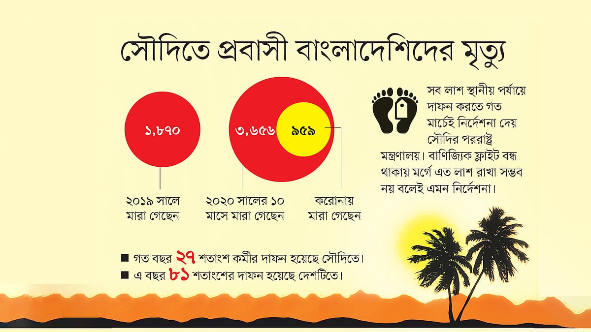 মারা যাওয়া প্রবাসীদের লাশ দেশে আনতে না পারা নিয়ে সৌদি দূতাবাসের দুই কর্মকর্তা বলেন, সৌদি আরবে মারা যাওয়া ব্যক্তিদের লাশ স্থানীয় পর্যায়ে দাফন করতে গত মার্চেই নির্দেশনা দেয় সৌদির পররাষ্ট্র মন্ত্রণালয়। করোনায় আক্রান্ত ব্যক্তিদের লাশ দ্রুত সংশ্লিষ্ট এলাকায় দাফন করা বাধ্যতামূলক। আর যাঁরা অন্য জটিলতায় মারা যাচ্ছেন, তাঁদেরও দ্রুত দাফনের কথা বলা হয়েছে। বাণিজ্যিক ফ্লাইট বন্ধ থাকায় মর্গে এত লাশ রাখা সম্ভব নয় বলেই এমন নির্দেশনা দেওয়া হয়েছে। তবে ৭২ ঘণ্টার মধ্যে লাশ বিমানে তোলার নিশ্চয়তা দিলে দেশে আনার অনুমতি পাওয়া যায়। ফ্লাইটের অভাবে এটি সব সময় করা সম্ভবও হচ্ছে না।