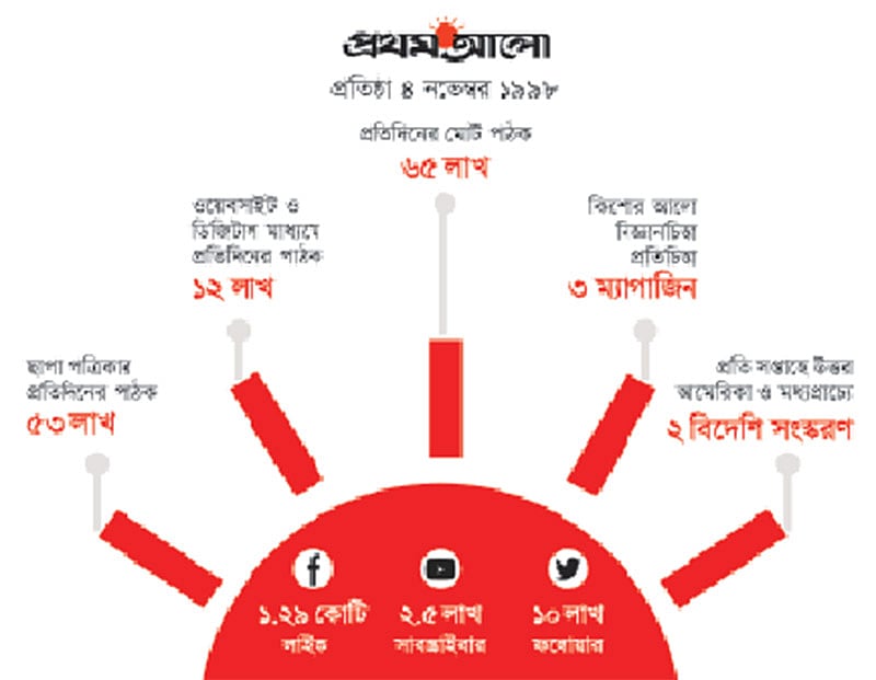 এভাবেই প্রতিদিন ছাপা প্রথম আলো পড়েন ৫৩ লাখ পাঠক, আর অনলাইনে পড়েন ১২ লাখ। আর ফেসবুকের প্রথম আলো র অনুসারী ১ কোটি ২৯ লাখ। প্রথম আলো অনলাইন বাংলা ভাষায় বিশ্বের সবচেয়ে বড় নিউজ পোর্টাল।