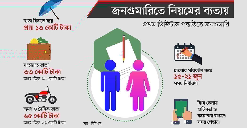১০ বছর পরপর করার বাধ্যবাধকতা থাকলেও এবার ১১ বছর পর হচ্ছে জনশুমারি। ফলে বর্ষা মৌসুমে ছাতা কেনাসহ ব্যয়ের নতুন খাত সৃষ্টি হয়েছে।
