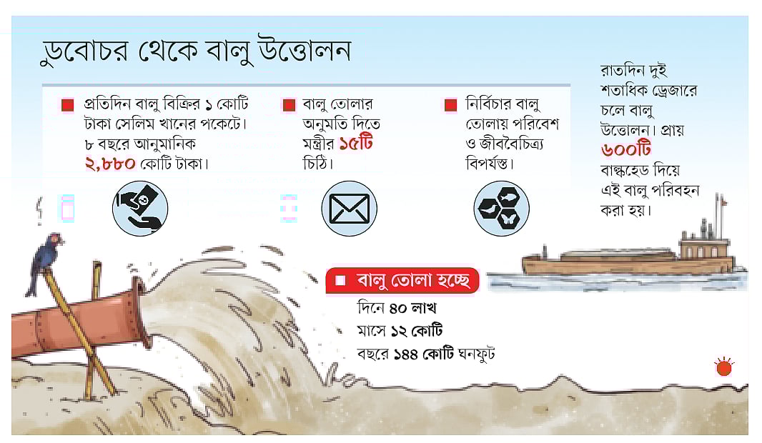 আট বছর ধরে নদী থেকে ইচ্ছেমতো বালু তুলছেন ইউপি চেয়ারম্যান সেলিম খান। জবাবদিহি করতে হয় না তাঁকে।