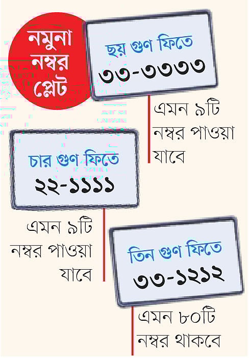 চার গুণ ফি দিয়ে পাওয়া যাবে আরও ৯টি নম্বর। এগুলোর অবশ্য নিবন্ধন নম্বর অর্থাৎ শেষ চারটি অঙ্ক একই হবে। তবে সিরিয়াল নম্বর পরিবর্তন হয়ে যাবে। যেমন ঢাকা মেট্রো-ক-২২-১১১১। একইভাবে হতে পারে ২২২২, ৩৩৩৩, ৪৪৪৪ ইত্যাদি।