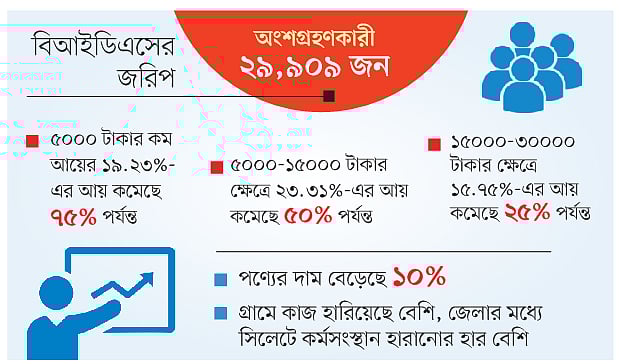 গবেষণা প্রতিষ্ঠান বাংলাদেশ উন্নয়ন গবেষণা সংস্থা (বিআইডিএস) গতকাল দেশের ২৯ হাজার ৯০৯ জনের ওপর জরিপ পরিচালনা করে এই তথ্য দিয়েছে। জরিপটি পরিচালনা করেছেন প্রতিষ্ঠানটির মহাপরিচালক কে এ এস মুরশিদ। একই অনুষ্ঠানে বিআইডিএসের গবেষণা পরিচালক বিনায়েক সেন একটি গবেষণা উপস্থাপন করে জানান, করোনার কারণে দেশের ১ কোটি ৬৪ লাখ মানুষ নতুন করে দরিদ্র হয়েছে। কোভিডের ছায়ায় বসবাস, খাপ খাওয়ানো, সমন্বয় ও প্রতিক্রিয়া শীর্ষক এক বিশ্লেষণী সংলাপে জরিপের ফল উপস্থাপন, দারিদ্র্য হারের এ প্রক্ষেপণ এবং ক্ষুদ্র ও মাঝারি শিল্প বিষয়ে একটি গবেষণা নিয়ে আলোচনা করা হয়।