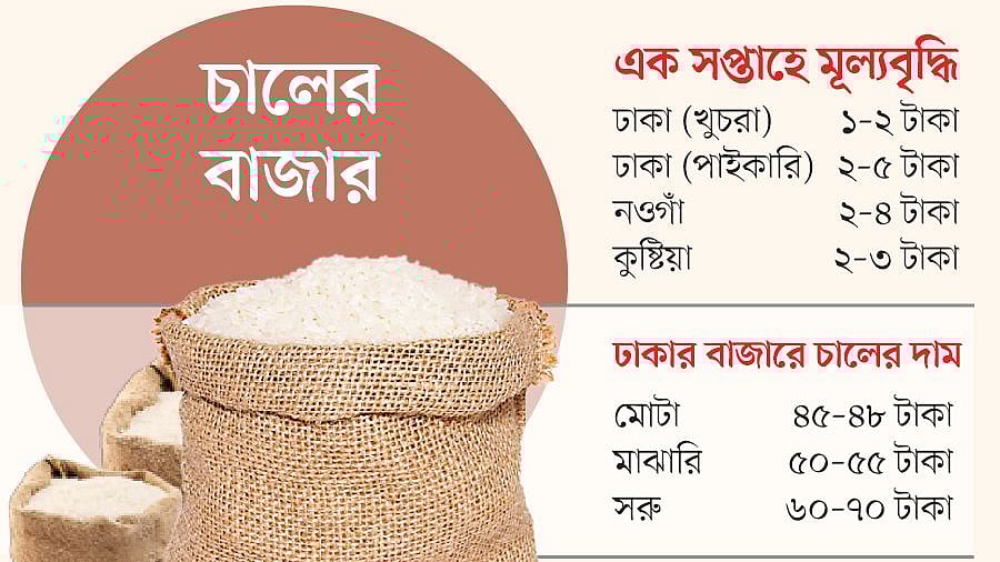ঢাকার পাইকারি ও খুচরা বাজার, কুষ্টিয়া ও নওগাঁর পাইকারি বাজার এবং চট্টগ্রামের বাজারে খোঁজ নিয়ে গতকাল সোমবার চালের দাম বাড়ার কথা জানা যায়।