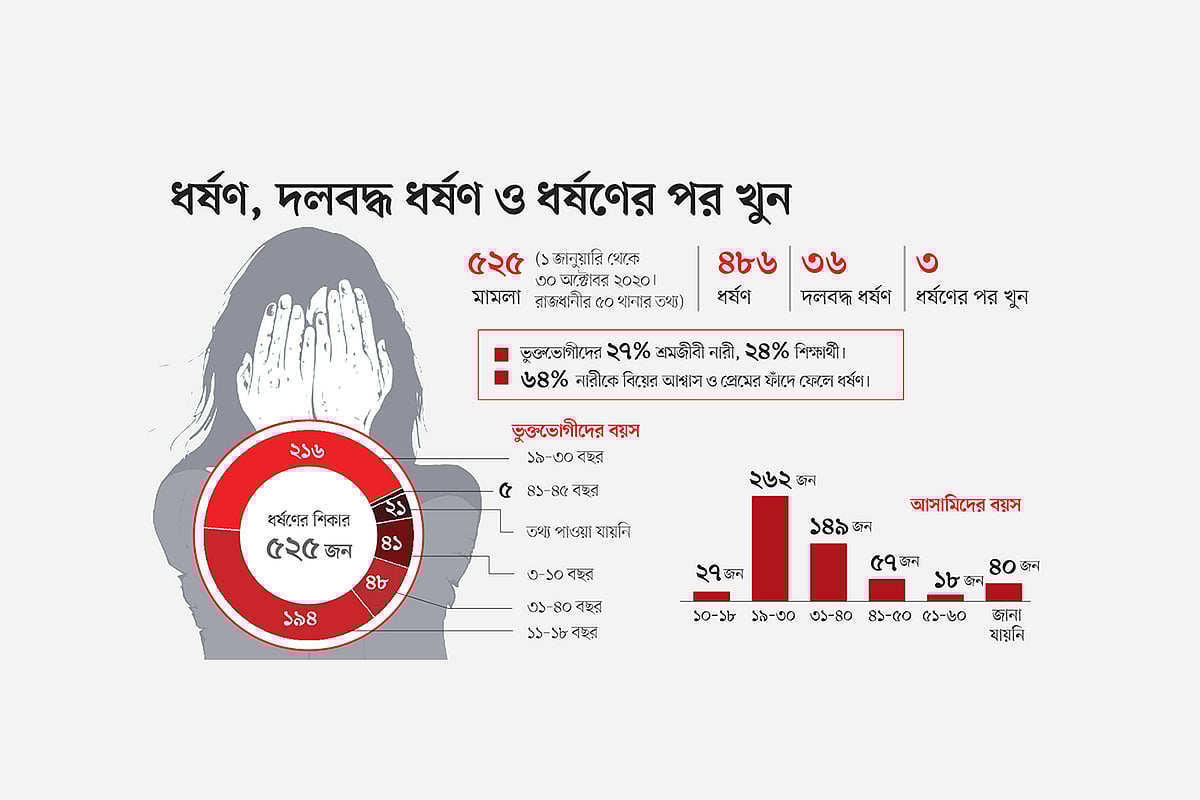 ধর্ষণের এ ঘটনাসহ চলতি বছরের জানুয়ারি থেকে অক্টোবর পর্যন্ত গত ১০ মাসে ধর্ষণ, দলবদ্ধ ধর্ষণ ও ধর্ষণের পর হত্যার ঘটনায় রাজধানীর ৫০টি থানায় মামলা হয়েছে ৫২৫টি। এর মধ্যে শিশু-কিশোরী ধর্ষণের মামলা প্রায় অর্ধেক (২৩৫টি)। প্রথম আলোর অনুসন্ধানে দেখা গেছে, ভুক্তভোগীদের ৪৫ শতাংশই শিশু–কিশোরী, যাদের বয়স ৩ থেকে ১৮ বছরের মধ্যে। মোট ৫২৫টি মামলার মধ্যে ১৮৬টি মামলার নথি পর্যালোচনা করেছে প্রথম আলো।