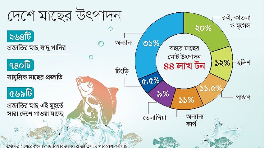 দেশে বছরে ৪৪ লাখ মেট্রিক টন মাছ উৎপাদিত হয়। মাছের প্রজাতির সংখ্যা হাজারের বেশি হলেও এই ৪৪ লাখ টনের বেশির ভাগই আসে ১০টি প্রজাতি থেকে। এর মধ্যে রুই, কাতলা ও মৃগেল থেকে পাওয়া যায় ২০ শতাংশ মাছ। বিদেশি কার্পজাতীয় মাছ থেকে ১১ শতাংশ, পাঙাশ সাড়ে ১১ শতাংশ, তেলাপিয়া থেকে ৯ শতাংশ আসে।